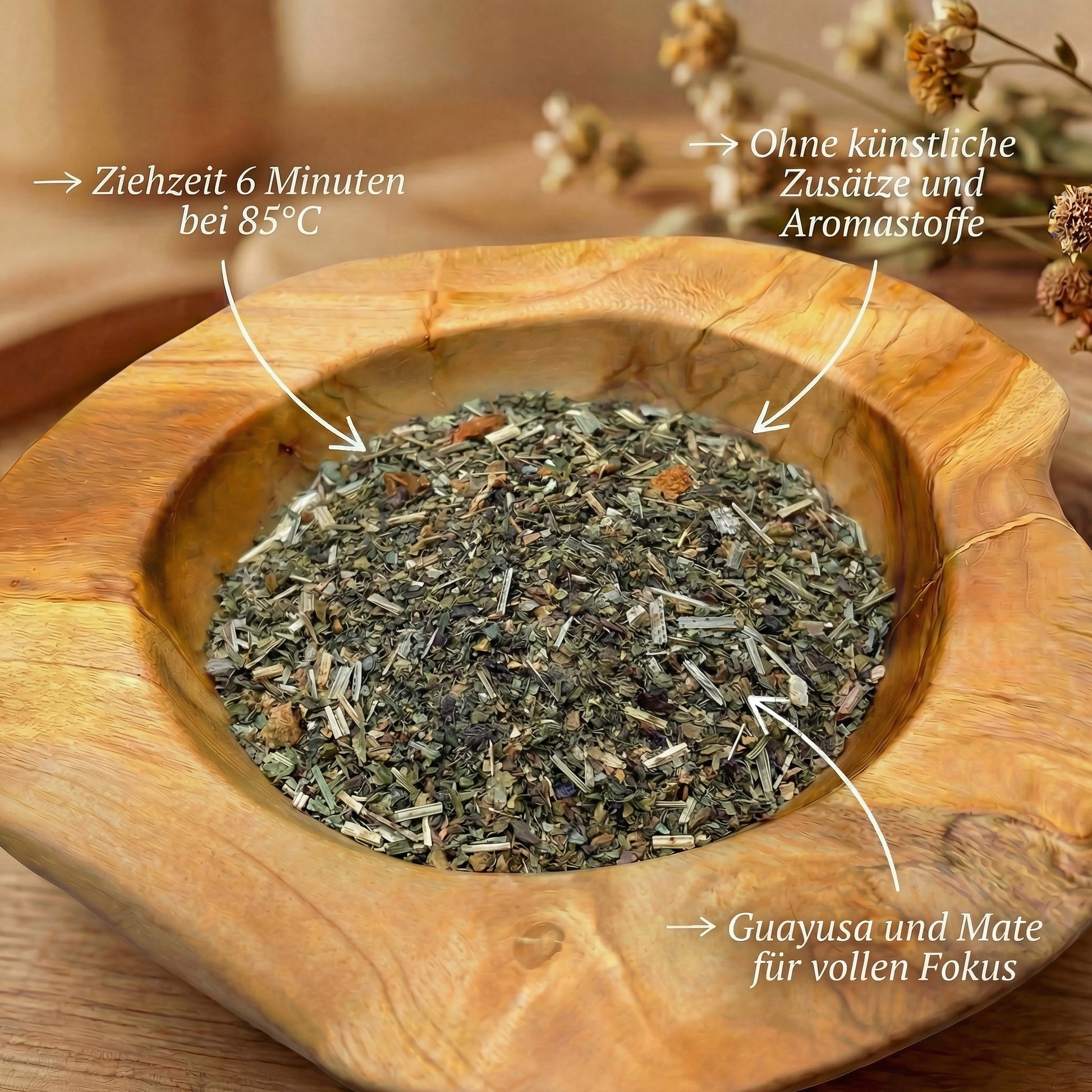 Kräftig und klar im Geschmack, mit natürlicher Frische durch Lemongras. Guayusa und Mate verleihen der Mischung ihren belebenden Charakter - ideal für fokussierte Momente.