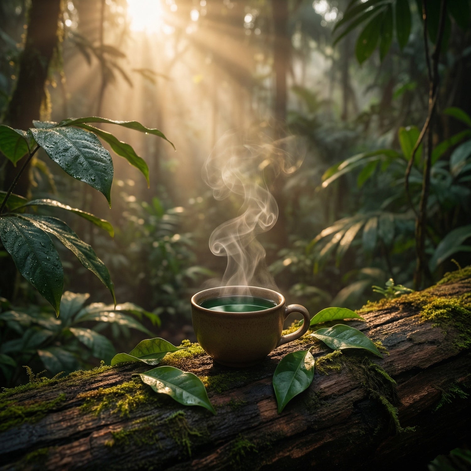 Guayusa und Mate bilden die kraftvolle Basis dieser koffeinhaltigen Blattmischung. Schon die Kichwa im