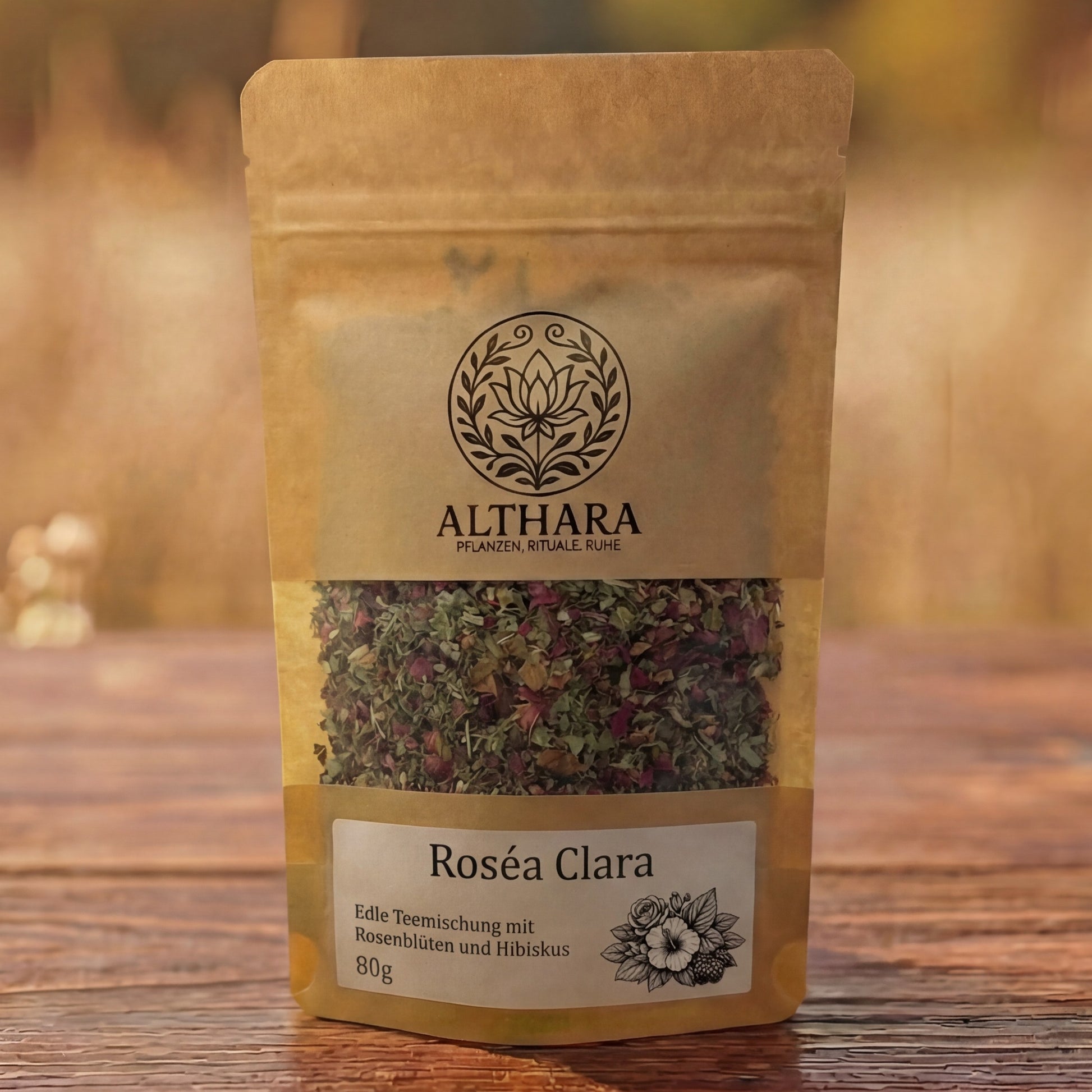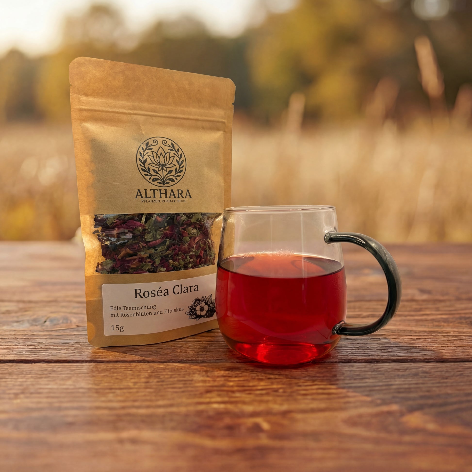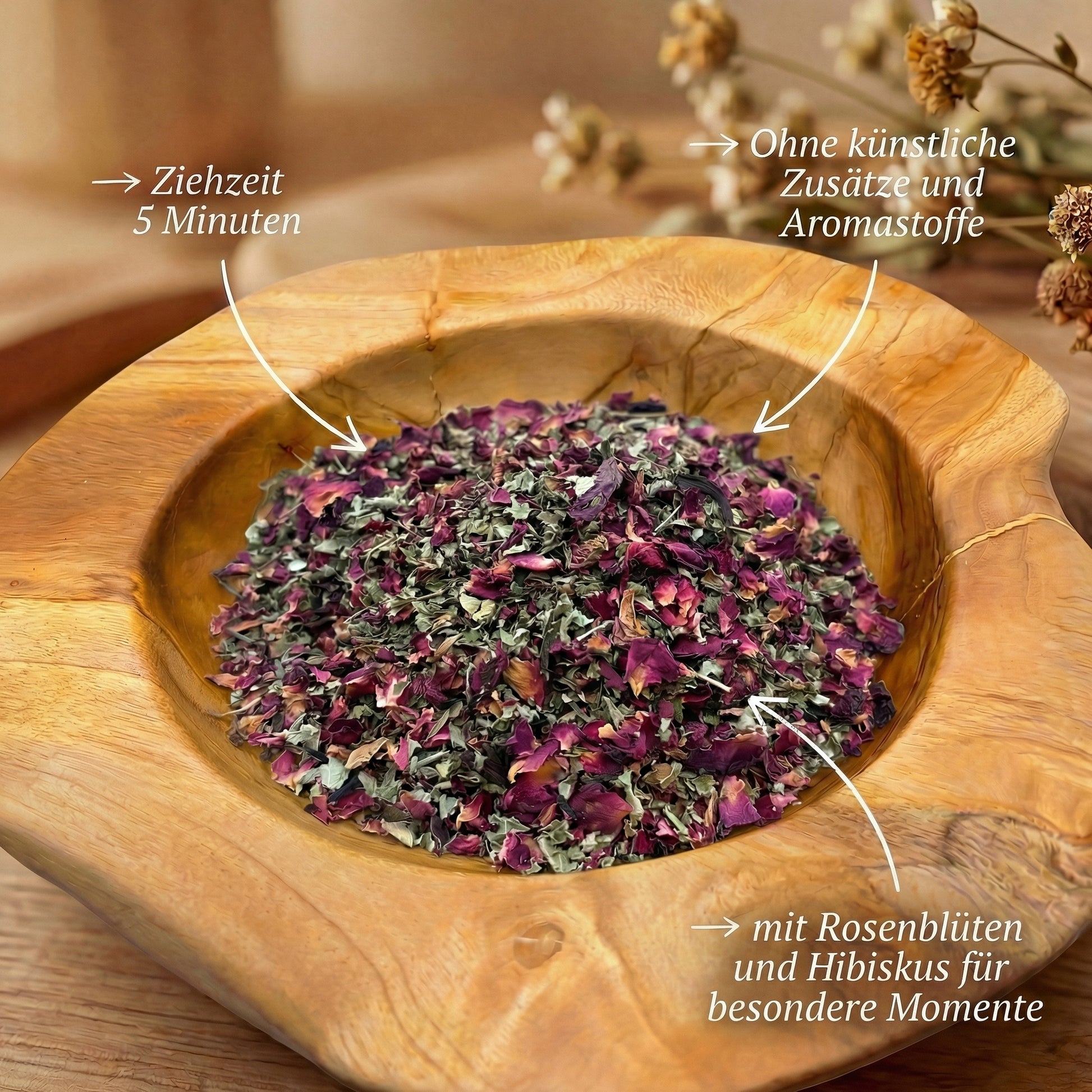 Feine Rosenblütenblätter prägen diese Mischung mit ihrem duftigen, eleganten Charakter und einer sanft floralen Tiefe. Hibiskus setzt einen fruchtigen Akzent und verleiht dem Aufguss eine lebendige, harmonisch abgestimmte Struktur.